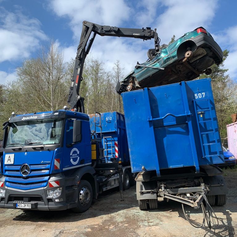 Mit unseren Kranfahrzeugen können wir problemlos Altautos, Maschinen usw. aufladen.